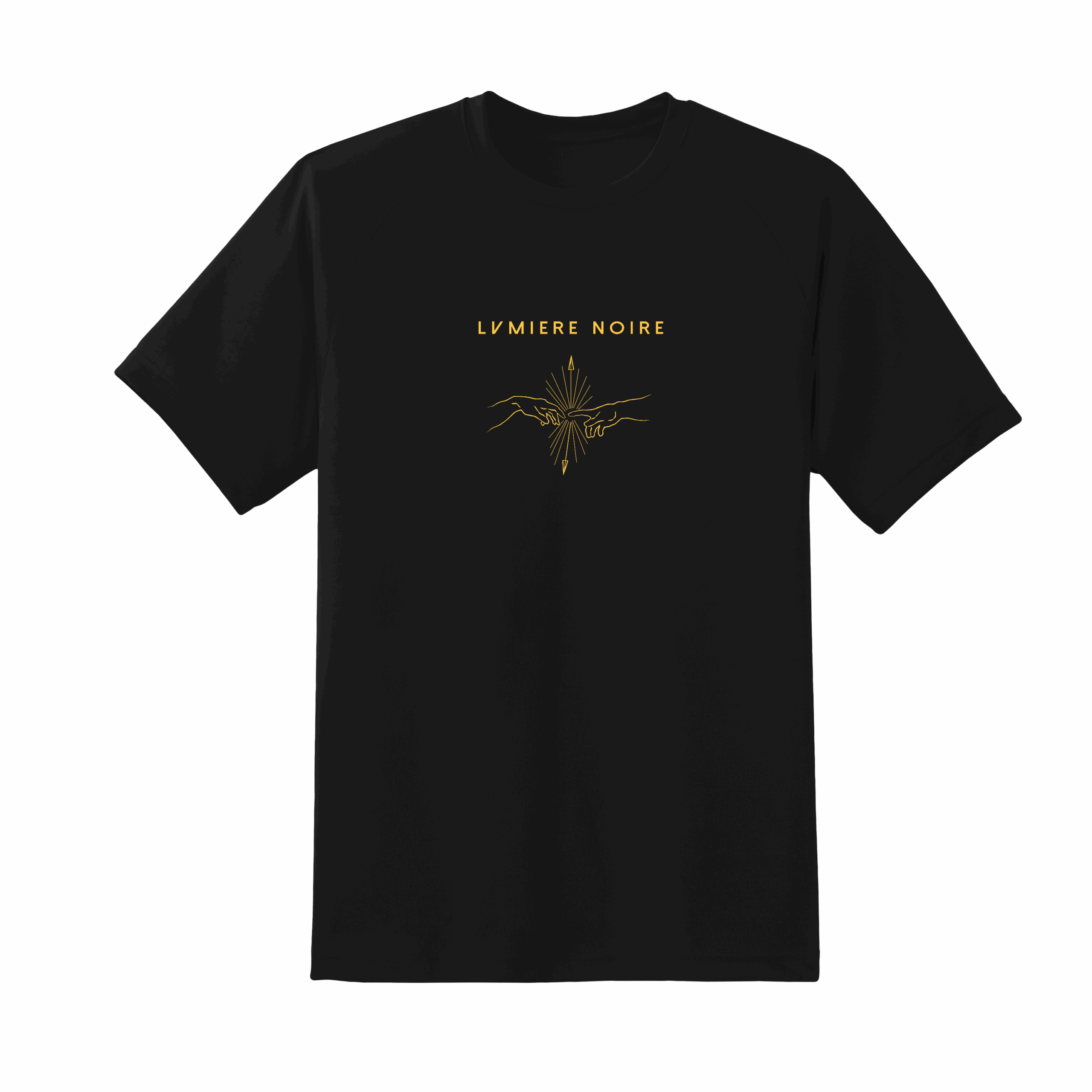 T-shirt full black grammage 330 g en coton avec logo Lumière Noire brodé avec du fil d’Or sur la face et au dos à l’encolure.